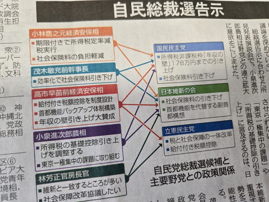 ――というわけで、どの候補者にとっても野党との協力関係、連立拡大をどこまでつかみ取るか、が鍵となります。具体的には小林さん、茂木さん、小泉さんが所得税非課税枠「年収の壁」178万円までの引き上げと社会保険料引き下げ(国民民主党、日本維新の会)を、高市さんは同178万円までの引き上げ、社会保険料の引き下げ、税と社会保障の一体改革(国民民主、日本維新、立憲民主)を、林さんは首都機能を代替する副首都構想、税と社会保障の一体改革(日本維新、立憲民主)といった具合です。